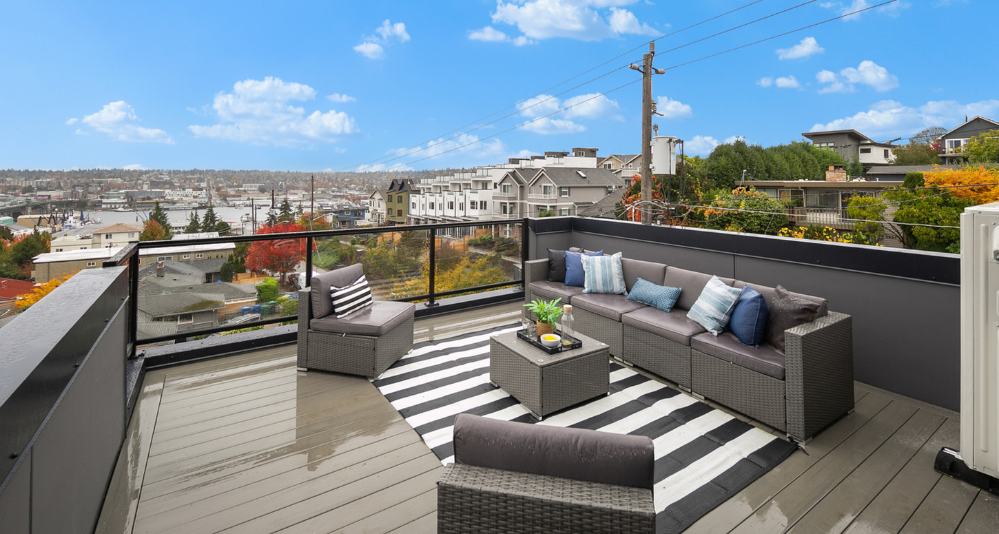 The community is situated on the hillside, providing incredible views of the Puget Sound, and offer between 1,986 and 2,162 square feet of living space. Each home has three bedrooms, two and a half bathrooms, and one assigned off-street parking stall. Additionally, each home features a rooftop deck, covered decks off the living room, and ground-floor patios/yard, creating ample outdoor entertaining spaces. The property is conveniently located near public transit and arterials, providing connectivity to Downtown through Queen Anne, Interbay, and Westlake, and close proximity to Ballard.